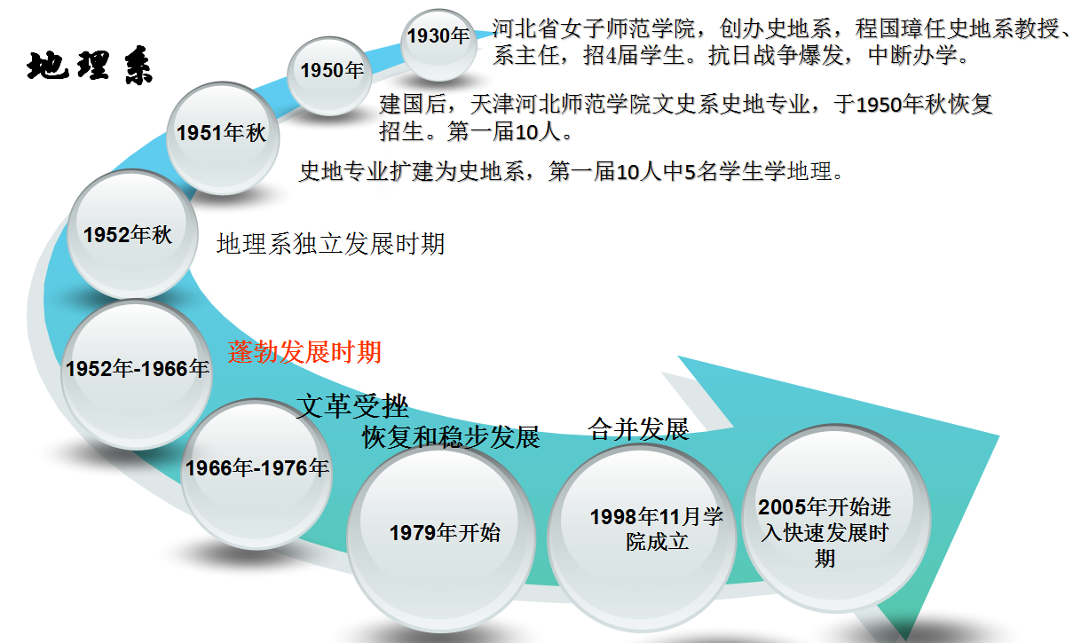 建国后,天津河北师范学院文史系史地专业,于1950年秋恢复招生。第一届10人。南开大学的邓绶林教授来系,成为第一位地理教师,同时,聘请南开大学的鲍觉民、黎国彬等为兼职教师。
