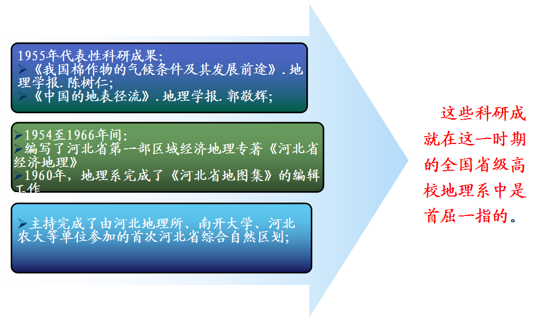 1952年秋,地理系建立,从此进入独立发展时期,教职工8人。邓绶林,郭敬辉先后任地理系主任。